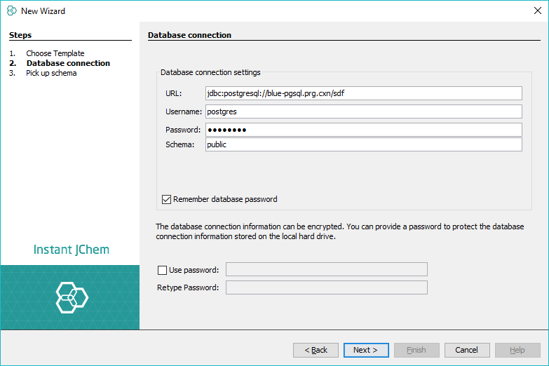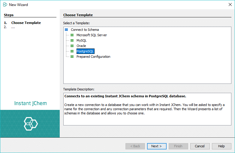 If another user has already set up an Instant JChem database in Oracle, MySQL or PostgresSQL then you may need to connect to this database and use it. There are two ways in which this can be done: