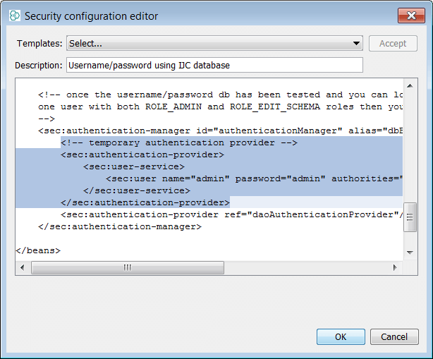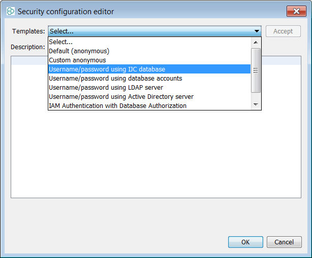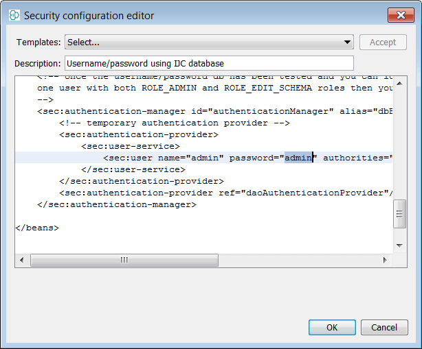 Now we will apply a policy. Select the Edit.. . button and then the drop down box with policy types. Different policy types are discussed and suffice to say some are more complex and require external configuration of O/S users. Select the policy type "Username/Password using IJC database" then press the Accept button and you will see some internal XML configuration displayed. Select OK and then take the advice of the second pop up and disconnect then re-connect to the schema as the admin user, to see the policy enforced (Right click schema node and choose Disconnect followed by double click on schema node). You will now see that you must provide login credentials during the schema init phase and initially you can use admin/admin.