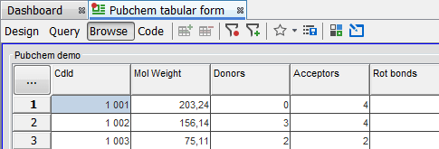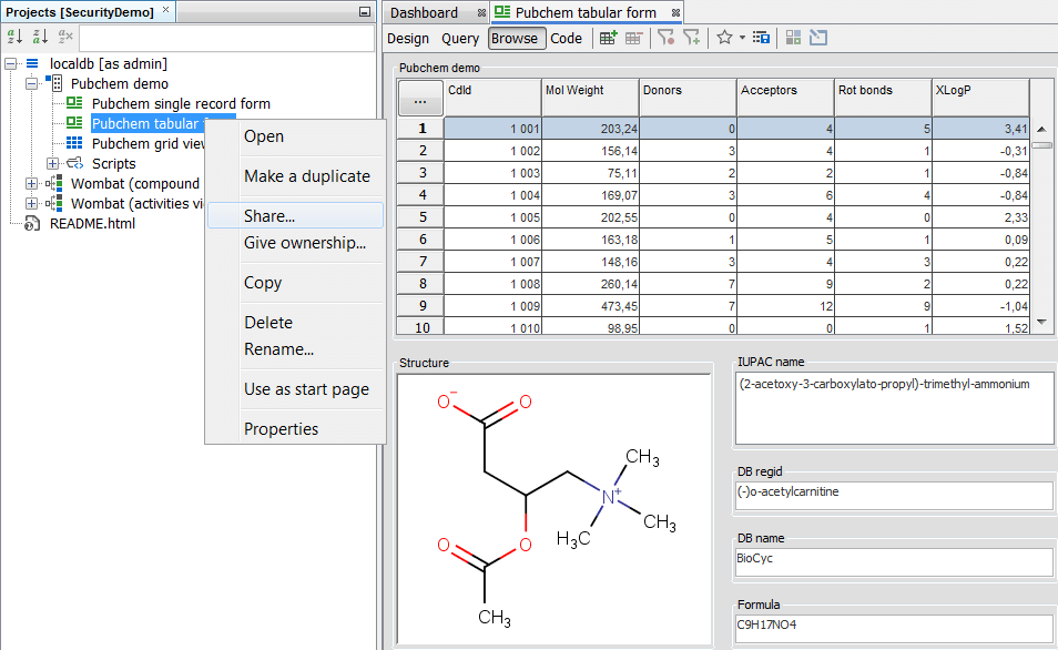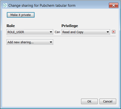 In order to interact with the data we must be able to access one of the form views and so far all of the form views are owned by admin. In order for other users to see them we must make them shared or visible. Expand the "PubChem Demo" data tree and open the "PubChem tabular form". Right click on the form and select the Share... option. Change the privilege for the ROLE_USER to Read and Copy from the dropdown menu and press OK. You can see the form icon has become "unlocked".