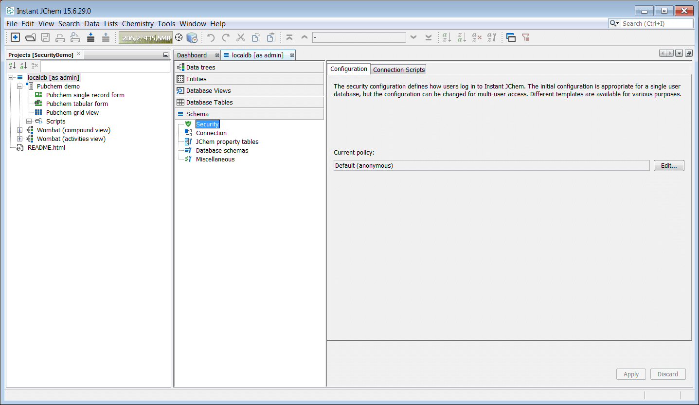 This tutorial will explain how to rapidly apply a security policy to the schemas in your projects. A security policy is applicable to each schema in your project and since each project can have many schemas then it is the case that a new policy is needed for each. The application of a security policy task is normally completed prior to schema deployment, once all the datatrees, entities, form views and any other objects in your schema and project are considered ready for real users to start using. Depending upon the level of privilege applied to a given user, that user can also create their own objects and decide to share access with other users. A default user "admin" is created with the policy so it is always possible for this user to login and amend other users capabilities. It is important to note that admin has the ability to create other admin users (and so on...) as well as remove the policy if required. For this tutorial, we will use the Derby database and the built in demo data that is bundled. The approaches are essentially similar using the Instant JChem interface hence we can practice with Derby. However there is one small caveat to consider. Even though many users can be created in a Derby schema, a limitation is that only one session is ever allowed, hence only one user can be connected at any one time. This in itself will not affect the explanation of IJC user and roles and will not be a consideration in the case of MySQL or Oracle where this limitation does not apply.