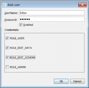 In the case of "Writer" we have assigned the roles "ROLE_EDIT_DATA" and "ROLE_USER". This user can read and write data but cannot make changes to the schema in any way.