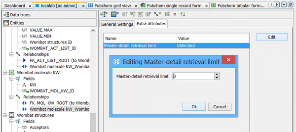 After clicking the content of this node, click the Extra Attributes tab in the panel on the right. This will show you current setting of the master-detail retrieval limit, which can be set either by double-clicking, or clicking the Edit button. By default, the limit is set to "Unlimited".