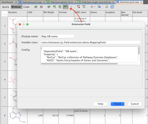 For example Map DB name, handler com.chemaxon.ijc.field.extension.demo.MappingField and configuration for mapping values from DB name field: