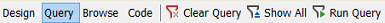 Once you have defined your query criteria you can execute it using the 'Run query' button in the toolbar (or hitting the Return key). This executes the query in exactly the way that it would be executed though the query panel and takes you back to browse mode. You can also clear the query or show all records using the appropriate buttons in the toolbar. When you return back to query mode your last query should be displayed.