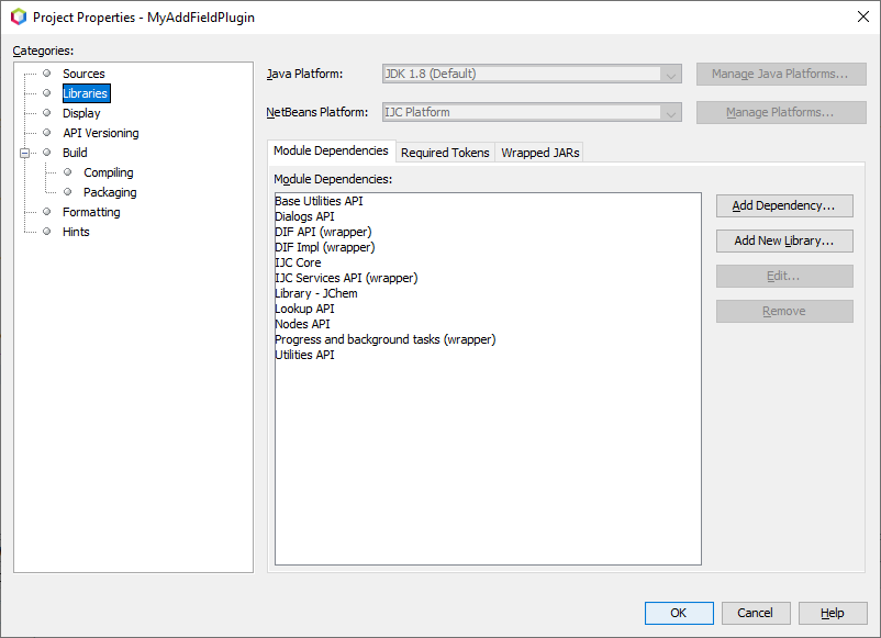 Our next step is to specify which APIs we want to use. Each API is provided by a module. Some of the APIs belong to the NetBeans API, while others belong to the Instant JChem API. Because our module is deployed to Instant JChem (ie. 'IJC Platform' that we set up earlier), which itself makes use of all NetBeans and Instant JChem APIs that we need, we can simply just set dependencies on modules available in 'IJC Platform'.