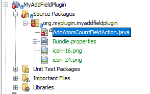 The wizard creates a new 'AddAtomCountFieldAction' class. In addition, the icons are copied into the module. You should see the action class in NetBeans 'Projects' explorer: