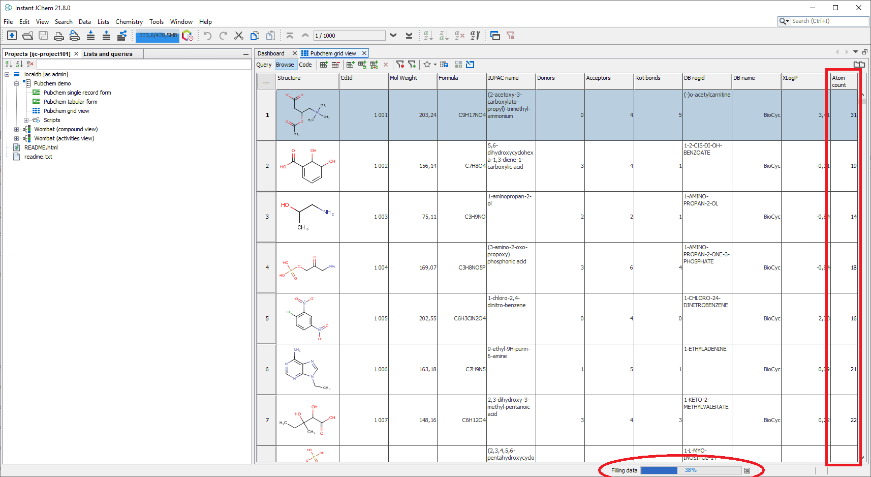 Edit -> Add Atom Count Fieldmenu item. It will add a new field called "Atom Count" to 'Pubchem demo' entity and will fill it with the actual atoms count for each structure.