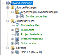 In your IDE go to main menu File -> New Project... and create a new NetBeans Modules -> Module project. Call the project MyAddFieldPlugin and don't forget to add it to IJC-Extensions module suite. As the module's 'Code Name Base' enter org.myplugin.myaddfieldplugin.