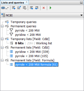The queries can be handled in a very similar way, just the number of options is much more limited. We will make both temporary queries permanent by choosing the Make Permanent option in the right-click menu. Subsequently, we will rename them to “pyridine < 200 MW” and “pyrrole < 200 MW” using the right-click menu Rename … option to match with the corresponding lists.