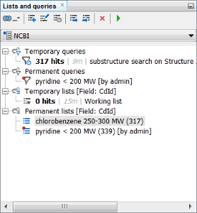 Let’s start with creating some temporary queries for the NCBI data tree. First, we can run a Substructure search for pyridine and add a condition of molecular weight below 200. A new temporary query and temporary list have been created for 339 hits.