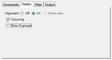 This tab lets you specify how you want your enumerated structures output. The default is to output them to the display area in the lower half of the window, in which case you can also specify the grid size. Alternatively you can output to a file. When this option is set you are prompted for the filename when you start the enumeration.
