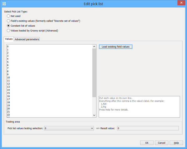 This is the easiest option. Pick list will access all the possible values in the field and make them available for selection. You need to load the available values from the database by clicking the "Load" button.