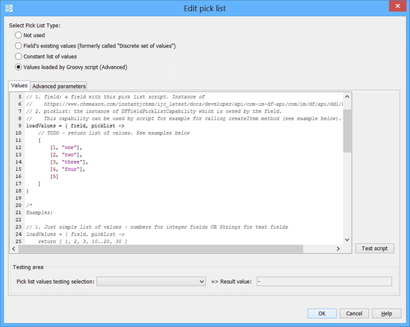 The last example shows a way how to load values from other field from different or the same entity. This can be useful if you have an entity with a field used only to store the list of values for pick list. By this, you can also share the same pick list definitions in various different entities simply by loading the values from one centralised place by using this script