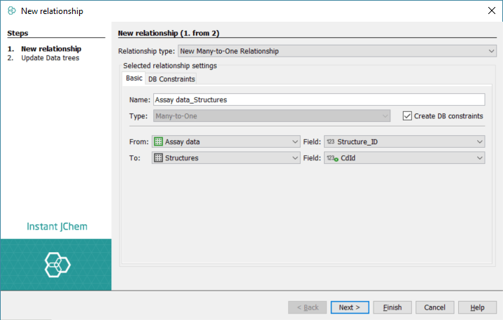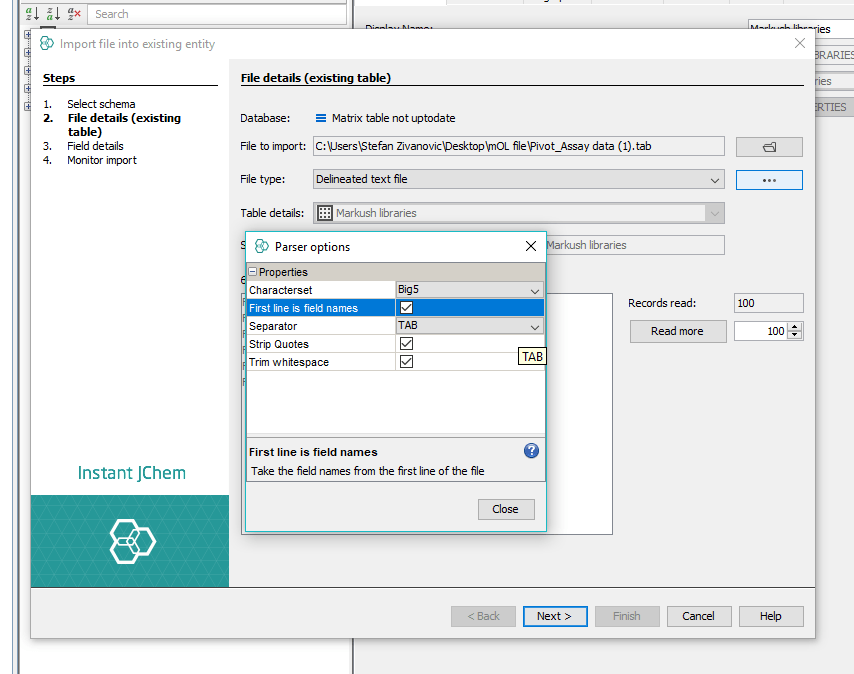 First, please create a new IJC schema with a local database as described here. Then you can create a structure entity called Structures and a standard entity called Assay data as described here in the documentation. Then, right click on the entity name and import the data to each of the entities - SDF file to the Structures and the TAB file to the Assay data. Please make sure you that you checked "First line is field names", in the first step of TAB file import (Fig. 2A) . Importing data into IJC is described here in the documentation or you can look into the tutorial. As soon as you have these two entities ready, you can bind them in a many-to-one relationship (Assay data Structure_ID are on the many side of the relationship and CdId in the Structures are on the one side) (Fig. 2B). The relationships are discussed here in the documentation or you can follow one of the other tutorials.