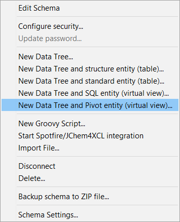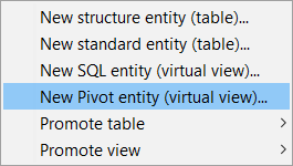 You can create the new pivot entity either using the right-click menu on the schema node in the projects window and the New Data Tree and Pivot entity (virtual view)... option (Fig. 4A) or using the schema editor, entities tab, where the right-click menu allows the selection of New Pivot entity (virtual view)... option (Fig. 4B).
