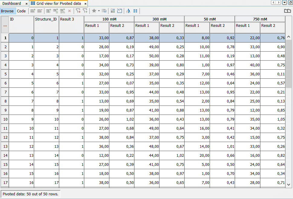 Such view can be utilized to query the original data and display the related pivoted values. In the screenshot below we have searched for the benzene substructure and Result 1 < 10. You can notice that the CdId selection allows you to compare the pivoted data for all three structures (Fig. 9).