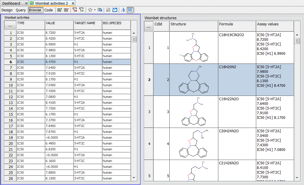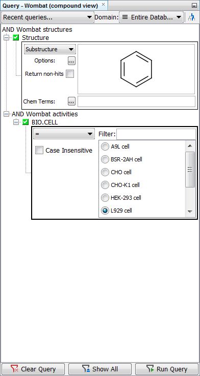 The model query on the Wombat demo data below uses the search for benzene substructure in the Wombat structures entity AND L929 cell in the Wombat activities entity. Without the filter turned on, three records from the Wombat activities table are shown in the hit list, although only one of them contains “L929 cell” value in the BIO.CELL field.