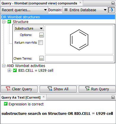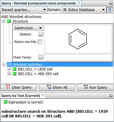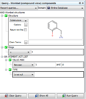 Queries are constructed using the basic units of fields and operators. A query can comprise of a simple condition such as 'MolWeight < 300', but also might include structural search terms either depicted as a chemical structure or in the form of Chemical Terms filters. Fields can be added to the query builder by right click on the query builder panel and select the field(s) to add. New fields are initially added with an AND operator and a change (to OR) here will apply to all fields subsequently defined. It is possible to add new AND/OR in addition to build up different logic to 'all' or 'any'. Once a field is added, you typically select from the available operators (e.g.'<' in the above example) and enter the value(s) ('300' in the above example). Once a suitable value is placed in the field the red cross will convert to a green tick, indicating a valid value is entered for that element of the query.