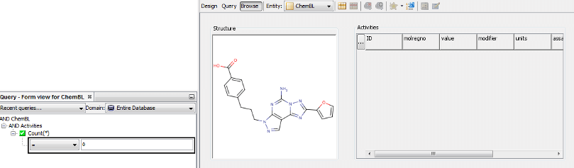For example, if we have a simple parent (Molecules/Structures) and child (Assay points) in a one to many relationship based upon some primary key (parent unique identifier) and wish to obtain all molecules that are yet to be screened we can assemble a query such as below in the Query builder. You will note that the COUNT field is only available at the detail level to facilitate this sort of query, it does not make sense at the parent level to retrieve a number of rows without any other criterion defined.