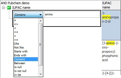 - 'contains amino' (equivalent to 'like %amino%')