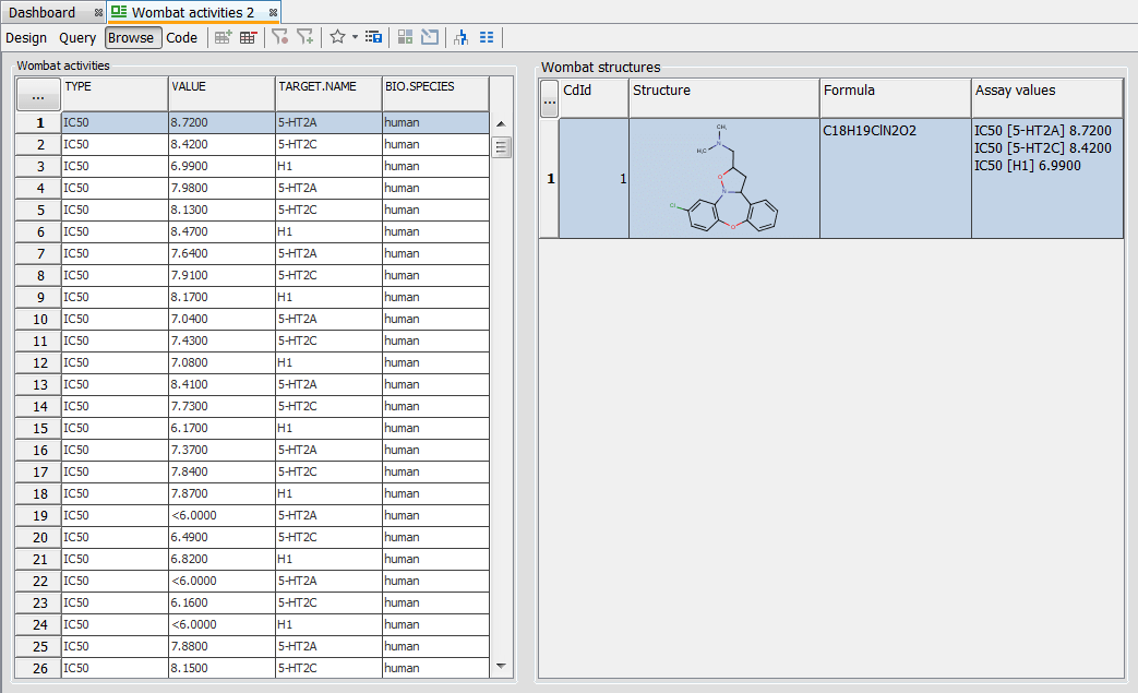 When the search is repeated with the filter turned on, only the record from the Wombat activities table containing “L929 cell” value in the BIO.CELL field is displayed.