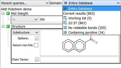 Queries can be executed against specific search domains. A domain can be the entire source database or a subset or list results of a previously executed query. A domain can be set by selecting from the drop down box of recently available domains in the data tree.
