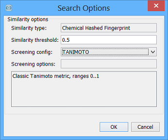) for a dialog that allows you to specify advanced searching settings, such as stereochemistry options and similarity search threshold (floor). Alternatively, once you have selected your search type you can right click and select 'Options'.
