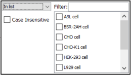 Wildcard searches are possible for text fields using the 'like' operator. Use the appropriate wildcard character for the type of database (usually % for zero or more characters and _ for a single character). For instance 'like amino%' will find all values starting with the term 'amino'. Shortcut operators are provided for some commonly used wildcard searches: