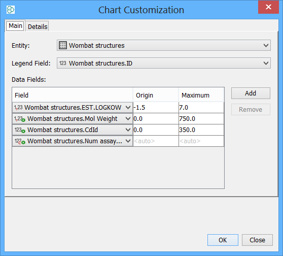 - The set of n fields whose data is displayed. This is restricted to numeric fields and can be added and removed accordingly.