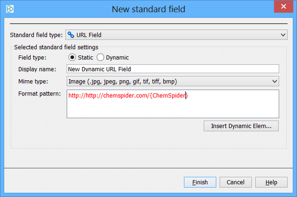 For dynamic URL fields no column is added to the database as the URL is stored as a template within the field definition. As a result the only options that need specifying are the name of the field, its mime type, and the template for the URL. The name and mime type are similar to those for static URL fields. The template needs to be entered into the text box, and the fields whose values will be substituted into the template to generate the final URL are specified using the 'Insert Dynamic Element' button that allows you to choose from the list of fields that are present. The field you choose will be inserted into the template at the current selection location. You can specify one or more fields. Doing so will generate a template similar to the one shown in the screen shot where the {casno} expression signifies that the value of the casno field will be substituted into the template at that position.