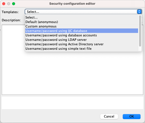 Set up security. Choose the 'Username/password using IJC database' as the security template.