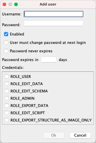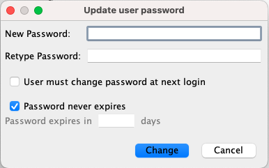 If you want to update password settings of an existing user, select the user in Users list and click on Update Password... icon. It will open the following window.