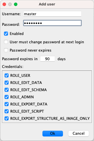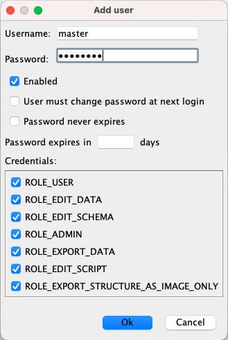 Add a user called 'master' and give all roles. This user will be your super-user. The username must be the same as the database username, but the password can be different.