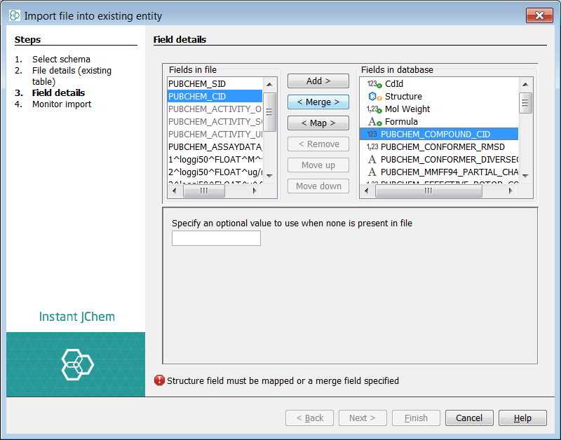 You can now see two lists of fields. The left list shows the potential fields from the source file. The right list shows the current and potential structure of the target entity. The Structure (ctab) from the file is automatically mapped to the structure column of the entity. The auto populated fields (green arrow) are visible and cannot be mapped to, if you select one no options are available. The two additional existing fields added above, are visible with no mapping. At this stage you can also specify a default value for these fields. For the purposes of demonstration we will set values here also. IJC has suggested 3 new fields to add, indicated by the sign.