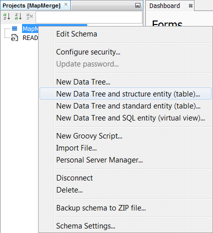 Next we should need to create a data tree with a structures table and there are two approaches to this. You can either Right click on the schema node and a menu will appear. Then select New Data Tree and structure entity (table)...