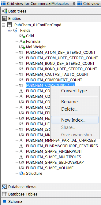Right click on the schema node and select Edit schema and the schema editor will open. At the entity level expand the description of the entity "PubChem_01ConfPerCmpd" and right click on the field "PUBCHEM_COMPOUND_CID" and select New Index . Rename your index if you wish and ensure the unique keys tick box is checked on - select Finish .