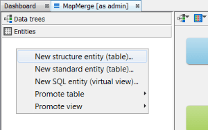 Alternatively, you could complete the same result with operations in the schema editor with the same result. Create a structures entity in the entities tab by right clicking New Structure entity (table)... . Then at the data tree level, promote it using New Data tree from entity ... Additionally, you can create the entity directly at the data tree level by selecting New Data Tree and structure entity (table)...