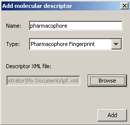 Here you must type the descriptor name, which can be anything. Then you should select the descriptor type and the descriptor XML file, which contains information about the custom fingerprint generation rules. You can define some additional configuration by clicking on the descriptor's name in the Molecular Descriptor tree. Give a name to the configuration and specify the XML file. By clicking on the 'Remove' button you can delete the currently selected descriptor or configuration in the Molecular Descriptor tree.
