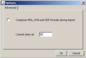 - Commit interval: A database option, which defines the batch size for import. Your compounds will be committed in accordingly sized batches to the database during the import process. The value of setting may effect the speed of import and the efficiency of duplicate search in case of parallel import (running in different Java virtual machines). If this value is increased the speed of import will increase but there will be a slightly bigger chance of importing duplicates in spite of filtering (if a duplicate comes in process A which was not committed in process B yet).