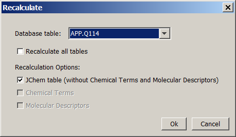 Three recalculation options exist. It is possible to recalculate either the standard JChem table fields, or the Chemical Terms fields of the JChem table, or the Molecular Descriptors which are stored in different tables, or even all of them. The recalculation options can be chosen with checkboxes, which are disabled if a given option is not possible for the selected table(s), e.g if there are no Chemical Terms defined. You can select one table, or recalculate all tables.