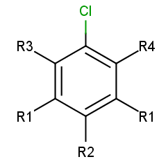 R-group decomposition is a special kind of substructure search that aims at finding a central structure - scaffold - and identify its ligands at certain attachment positions. The query molecule consists of the scaffold and ligand attachment points represented by R-groups. These R-groups are simple R-group atoms without R-group definitions. An example query structure is shown below: