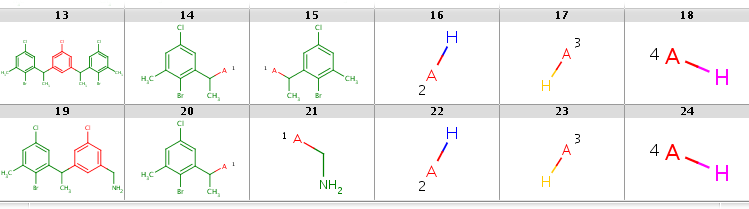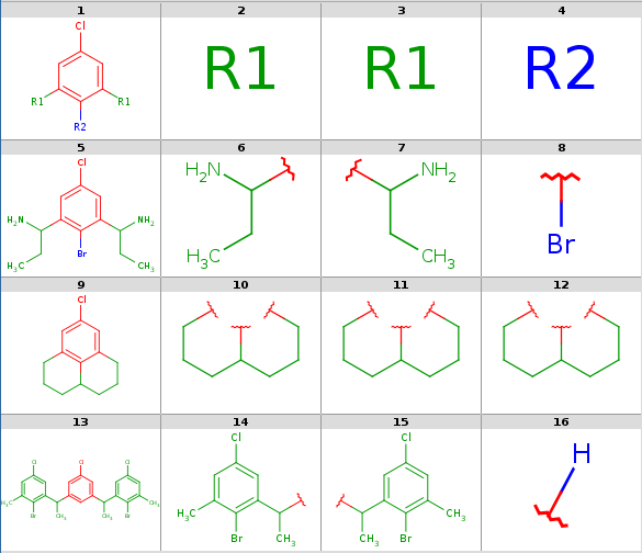 ``` rgdecomp -k -m Rs -q query.mol targets.sdf --bridgingRAllowed:y -a P -f mrv:-a -o resultR.mrv mview --gridbag -c 6 -r 4 resultR.mrv ``` ``` rgdecomp -k -m Rs -q query.mol targets.sdf --bridgingRAllowed:y -f sdf:-a -o resultR.sdf mview --gridbag -t DMAP -p Colors.ini -c 6 -r 4 resultR.sdf ``` <a name="src-1806750-safe-id-ui1ncm91cerly29tcg9zaxrpb25vc2vyj3nhdwlkzs1yzxn1bhrzug"></a> **Decompositions with R-grouped query, any-atom attachment markers**