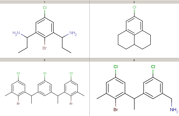 -fparameter we automatically switch to molecule series output as default output style and also enable the storage of atom color data in atom sets that are shown with different colors in MView. We specify the number of table columns in theMViewoption-c. The decompositions are shown below: