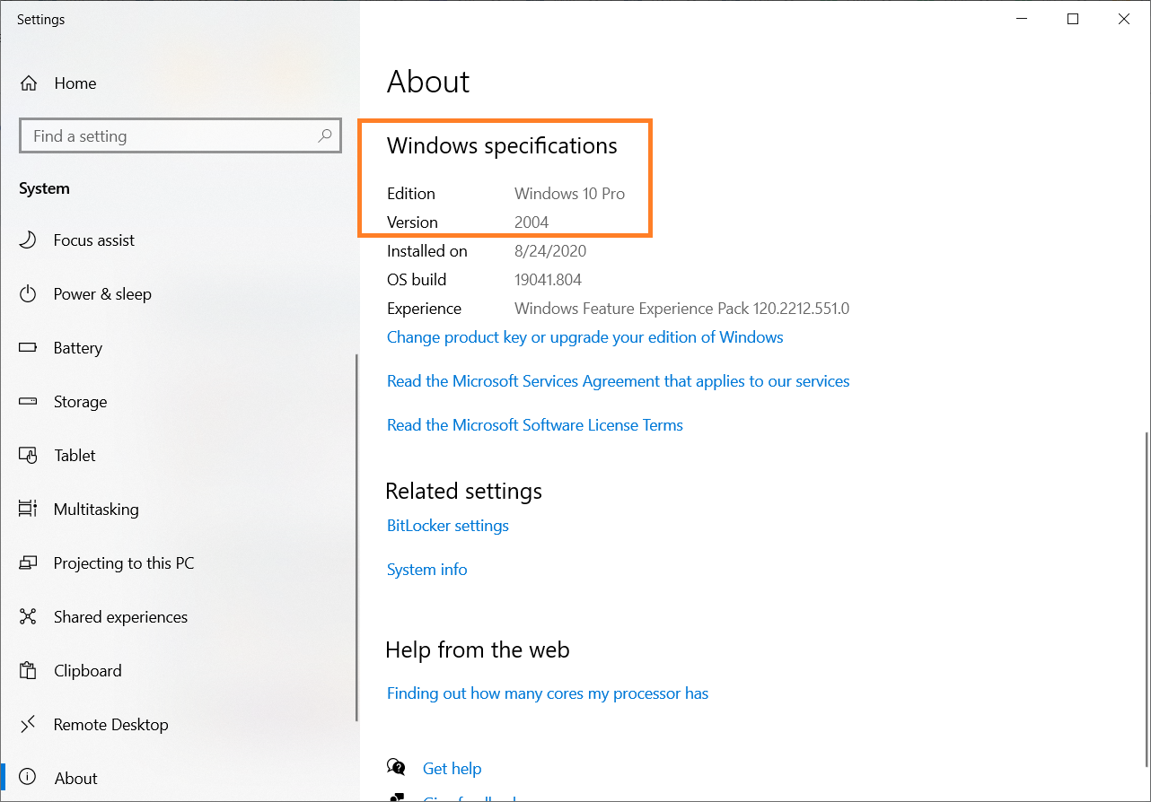Windows version: type "About" in the search bar at the left bottom of the screen