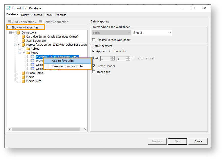 The filtering can be done by using the Show only favorites checkbox, located at the top of the Import from Database dialog.