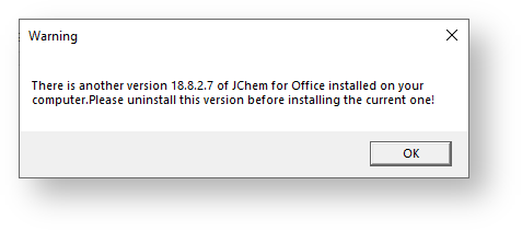 We also check if any previous JChem for Office add-in or maybe other Office add-ins are already installed on the computer. If a previous version of JChem for Office is still available, it must be uninstalled. This is necessary as installing the same software with different version numbers can cause problems.