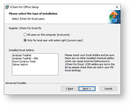 You can specify if you would like to install for the user you are logged in with (Only for local user with admin right option) or for all the user accounts created on the computer (All users on this computer option). The latter option means that JChem for Office will be registered for all users, which are available on the local computer, the former option means that it will be registered only for the single local user if it has administrator privileges. In the case of all users install, please note that all running Microsoft Office applications have to be closed in every user's profile, otherwise the install will not succeed for those users. Other users can be logged in or logged out meanwhile the install process, it does not matter, one of the most important thing besides closing all running Microsoft Office application in other user's profile is that only the Administrator can initiate the install process.