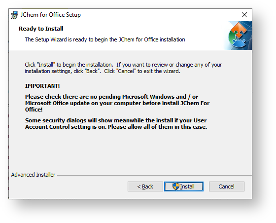 Please note that you always have to be an administrator or must have administrator rights on the computer to be able to install JChem for Office properly.