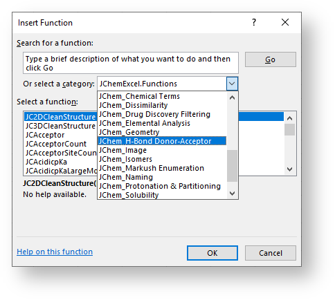 Since version 6.0 of JChem for Excel, the Help on this function button is available for JChem for Excel functions in the Function Arguments dialog.