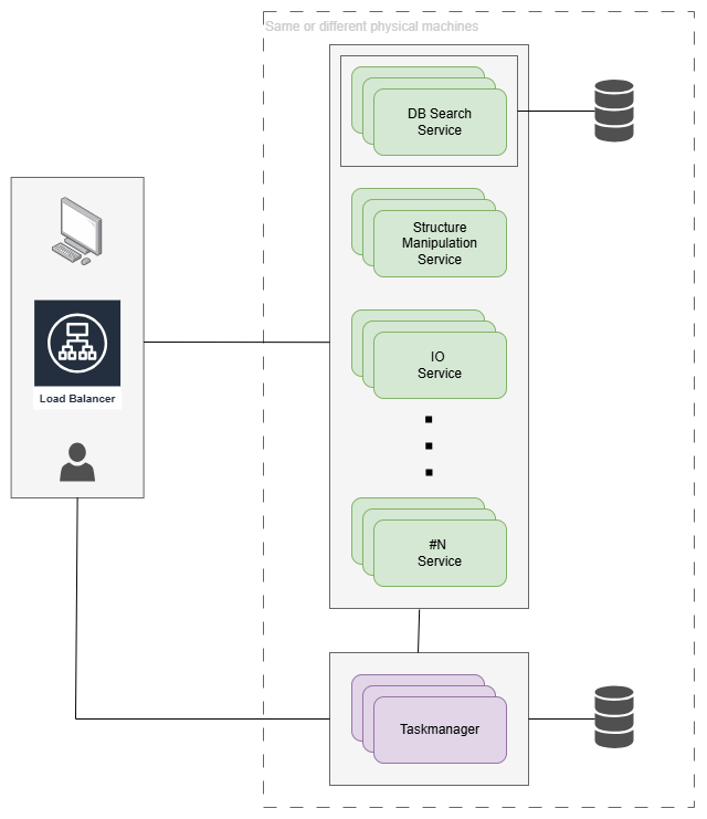 JChem Microservices – except DB Web Services and Task Manager – are stateless services creating the opportunity for running more instances of them through a load balancer.